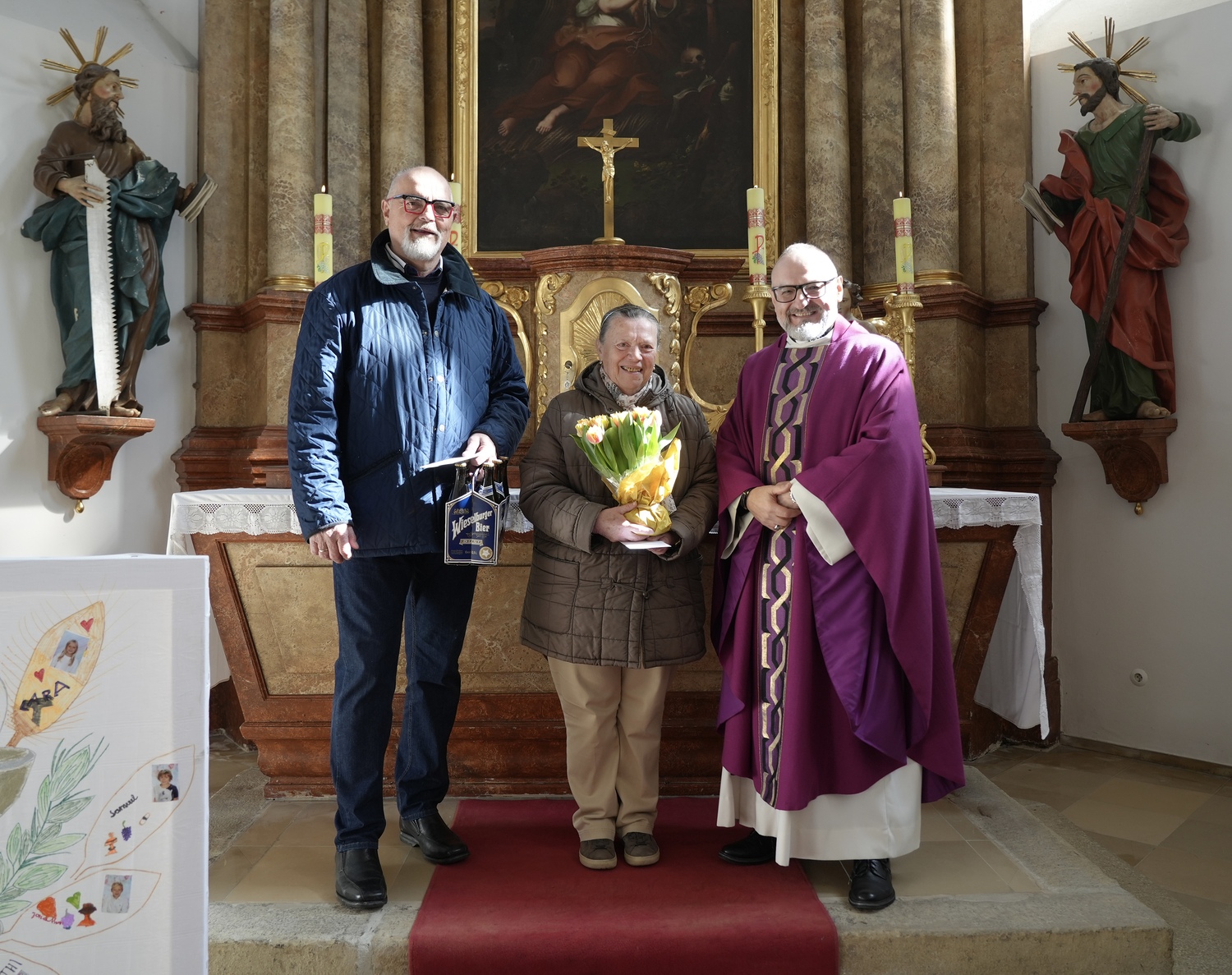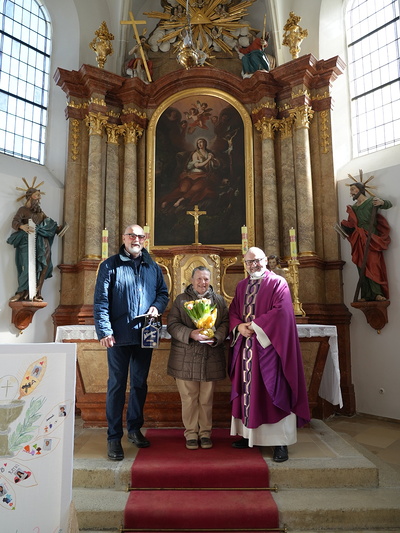 Im Anschluss an die Familienmesse in der Kirche Altlengbach gratulierte Pfarrer Mag. Tomasz Tomski den beiden Pfarrgemeinderäten Eva Zeitler und Walter Denk herzlich zu ihrem 75. Geburtstag. Als Zeichen der Wertschätzung für ihr langjähriges Engagement in der Pfarrgemeinde überreichte er den Jubilaren Geschenke und sprach ihnen im Namen der Pfarre Dank und Glückwünsche aus.