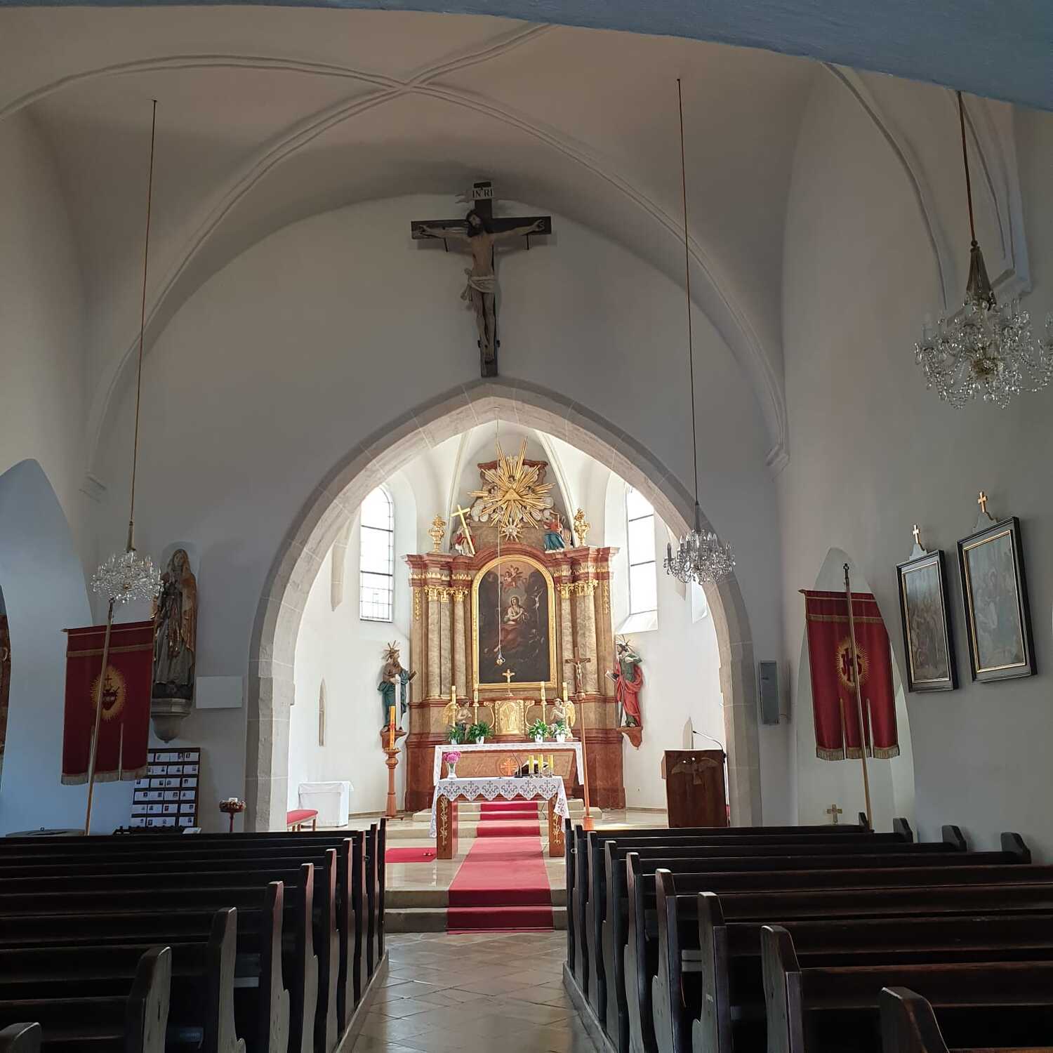 Genaue Baudaten der Kirche fehlen. Das Langhaus, das im Kern noch aus der 2. Hälfte des 13. Jahrhunderts stammt, war nicht gewölbt, sondern mit einer Flachdecke versehen. An diesen romanischen Grundbau schließt der weite Chorbau aus der 2. Hälfte des 14. Jahrhunderts an, wo auch das gotische Kreuzrippengewölbe vorhanden ist.
